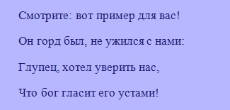 Но лучше всего передается идея стихотворения посредством возвышенной лексики. И в то же время автор не жалеет слов для выражения отношения толпы к пророку: «глупец», «угрюм, и худ, и беден». Поэт достаточно в грубой форме выражает голос толпы, и в этом, так или иначе, читается противопоставление его «чистым» намерениям.