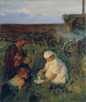 Прямо посредине картины располагается большое вспаханное поле. Полностью рассмотреть данное поле просто невозможно, а все, потому что оно очень широкое. Постепенно день заканчивается и наступает вечер, а за ним придет ночь. Тракторист вместе со своим сыном решили немного передохнуть, а потом продолжить свою работу. А поскольку они очень сильно устали за день, то решили отдохнуть и поесть прямо на земле рядом с трактором. Ужин им принесла его старшая дочь, и они сразу же переключились на него пока он еще горячий и вкусный.