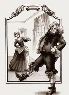 Его трезвомыслящая супруга высказалась решительно против прогулки своего мужа по парижским улицам, так как он и без этого сделался посмешищем в городе. Не принесло успеха стремление впечатлить служанку и жену плодами обучения. Николь спокойно произнесла “у”, а затем без всяких правил уколола шпагой своего хозяина.