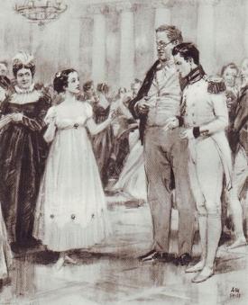 В 17 лет Наташа впервые выходит в свет, попадает на бал. Мужчины говорят, как она красива, как легко и непринужденно танцует. Девушке к лицу белое кисейное платье с розовыми лентами. Князь Болконский влюбляется в Наташу, оценив ее грацию, тонкий стан и робкую походку в обществе.