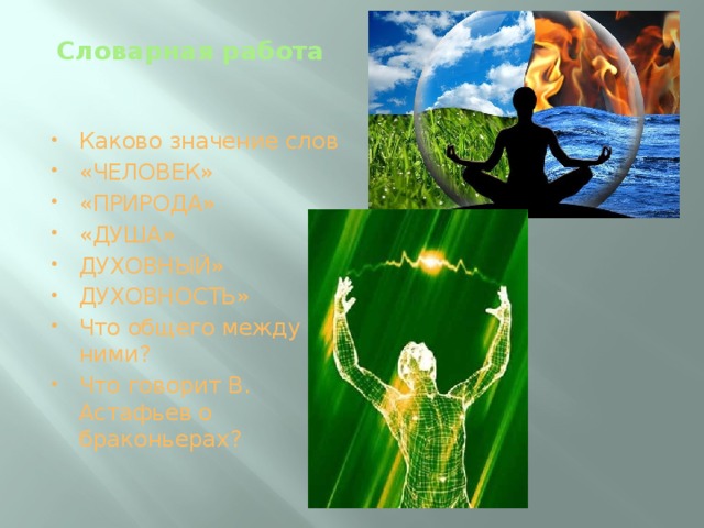 Задание: значения слов «человек», «природа», «душа «, «духовный», «духовность»